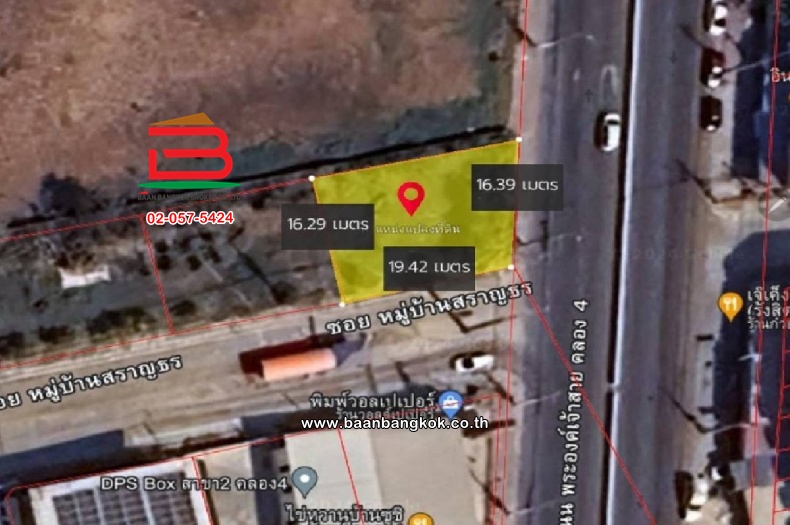ประเภททรัพย์สิน : ที่ดินเปล่า ถมแล้ว หน้ากว้าง 19.4 เมตร ลึก 16.3 เมตร อยู่หน้าหมู่บ้าน สราญธร คลอง 4 ทำเลดี ติดถนนคลอง 4