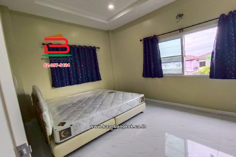ติดผ้าม่าน พร้อมเตียง-ที่นอน 6 ฟุต อย่างดี 2 ชุด (มีพลาสติกหุ้มใหม่ยังไม่ได้แกะ) พร้อมแอร์ 1 เครื่อง ต่อเติมเต็มพื้นที่ ภายในบริเวณบ้านเงียบสงบร่มรื่นน่าอยู่อาศัยเป็นแหล่งชุมชนฉลองกรุง มีห้างสรรพสินค้าแหล่งของกินมากมาย การเดินทางเข้าออกได้หลายช่องช่องทาง
