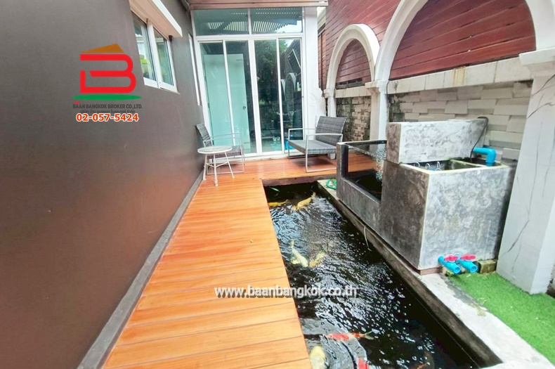 การตกเเต่ง : พื้นชั้นล่างปูแกรนิตโต้ ชั้นบนปูลามิเนต ห้องโถงกว้าง ห้องครัวบิวท์อิน มีพื้นที่ซักล้าง ส่วนด้านข้างบ้านทางขวามือแยกจากตัวบ้านเป็นห้องคาราโอเกะ สามารถจุคนได้ 20 คน ห้องฟิตเนส มีสระเลี้ยงปลาคาร์ฟไว้นั่งจิบกาแฟยามเช้า บรรยากาศดี ภายในติดเหล็กดัด+มุ้งลวด+ปั้มน้ำ+แท็งค์น้ำ+แอร์ ในโครงการมีสิ่งอำนวยความสะดวก อาทิ เช่น สนามเด็กเล่น, สระว่ายน้ำ, ฟิตเนส, สโมสร, CCTV, รปภ.