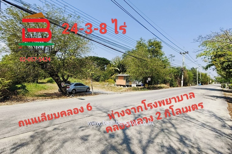 ประเภททรัพย์สิน : ที่ดินเปล่า ติดถนนเลียบคลอง 6 หน้ากว้าง 35 เมตร ตั้งอยู่ในเขตพื้นที่สีชมพู ห่างจากถนนรังสิต-นครนายก 7 กิโลเมตร เข้าจากถนนพหลโยธินประมาณ 15 กิโลเมตร ถนนหน้าแปลงกว้าง 6 เมตร สาธารณูปโภคพร้อม ไฟฟ้า, ประปา, ท่อระบายน้ำ เหมาะทำโครงการหมู่บ้านจัดสรร โกดังสินค้า ทำเลดีเดินทางเข้าออกสะดวกได้หลายช่องทาง