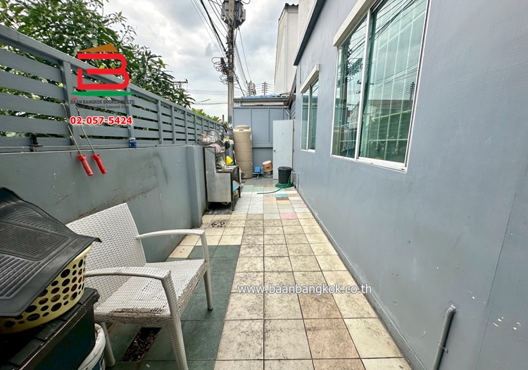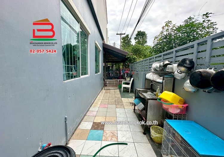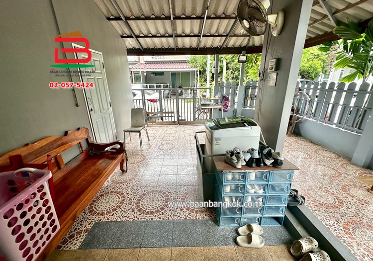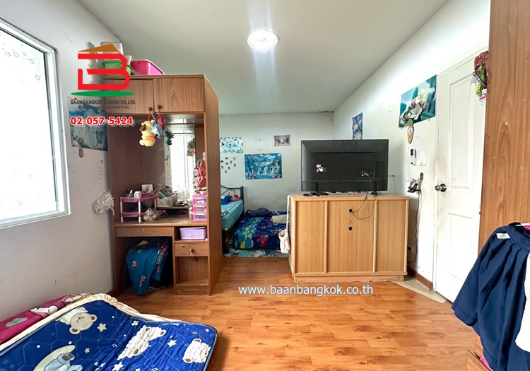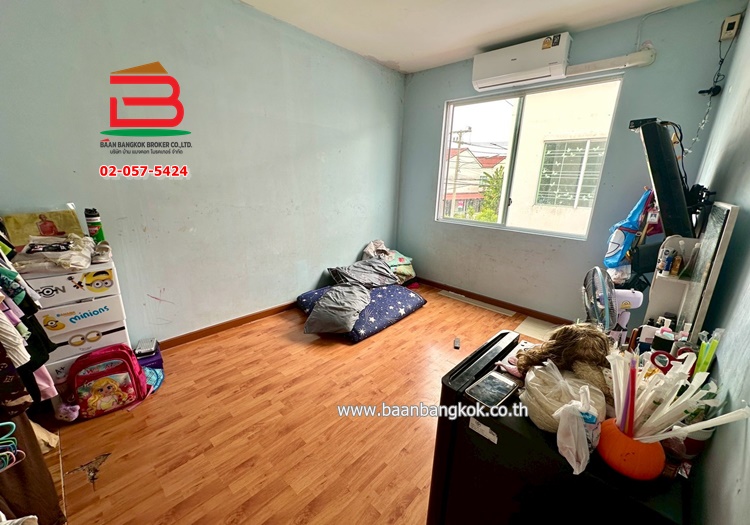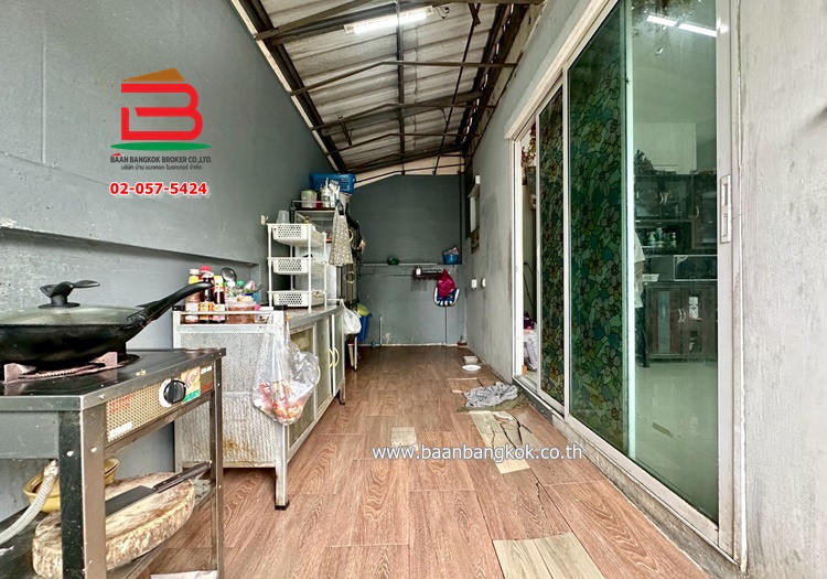 การตกแต่ง :  พื้นชั้นล่างปูกระเบื้องแกรนิตโต้ ต่อเติมครัวและโรงจอดรถ ชั้นบนปูด้วยไม้ปาเก้ แถมแอร์ 2 เครื่อง