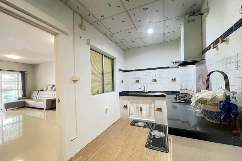 การตกแต่ง : ต่อเติมห้องครัวพร้อมเคาน์เตอร์และหลังคาหน้าบ้านพร้อมระแนงสองฝั่งมีแอร์สองตัวปั๊มน้ำ พร้อมแท๊งค์น้ำ เตาแก๊สฝัง เครื่องดูดควัน เครื่องทำ น้ำอุ่น มีผ้าม่านทุกห้องเหล็กดัดทั้งบ้านจานดำ เฟอร์นิเจอร์บางส่วนพร้อมอยู่สงบเพื่อนบ้านดีเหมาะแก่การอยู่อาศัยเข้าซอยไม่ลึกอยู่ใน ซอย 6 อยู่ต้นซอยความปลอดภัยรปภ. 24 ชั่วโมง